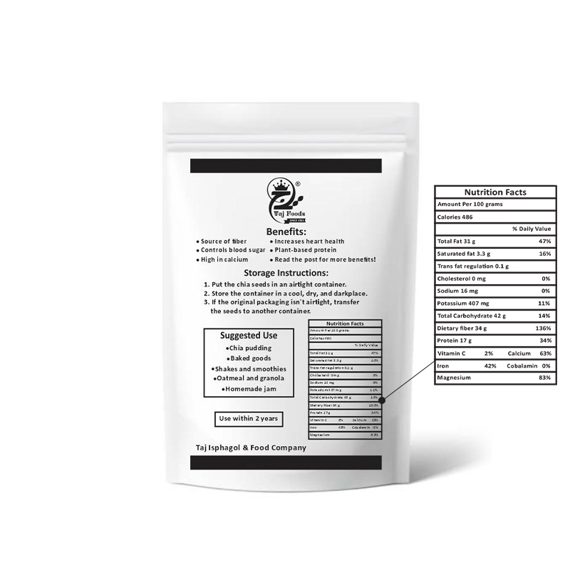 nutrient-dense superfood packed with fiber, omega-3 fatty acids, and plant-based protein, supporting digestion, heart health, and overall well-being. Our premium chia seeds are carefully sourced and processed to preserve their natural goodness and nutritional value.